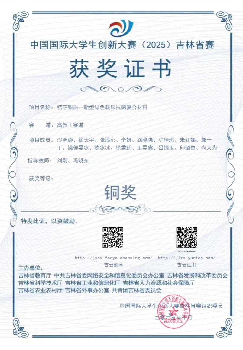 我院冯晓东、刘刚老师指导学生参加中国国际大学生创新大赛吉林省赛斩获佳绩 来源:本科教育 2025/11/07 日前,由吉林省教育厅、共青团吉林省委等10个部门共同主办的中国国际大学生创新大赛(2025)吉林省赛圆满落下帷幕。我院冯晓东、刘刚老师指导学生作品《秸芯银盾——新型绿色载银抗菌复合材料》荣获省级铜奖。